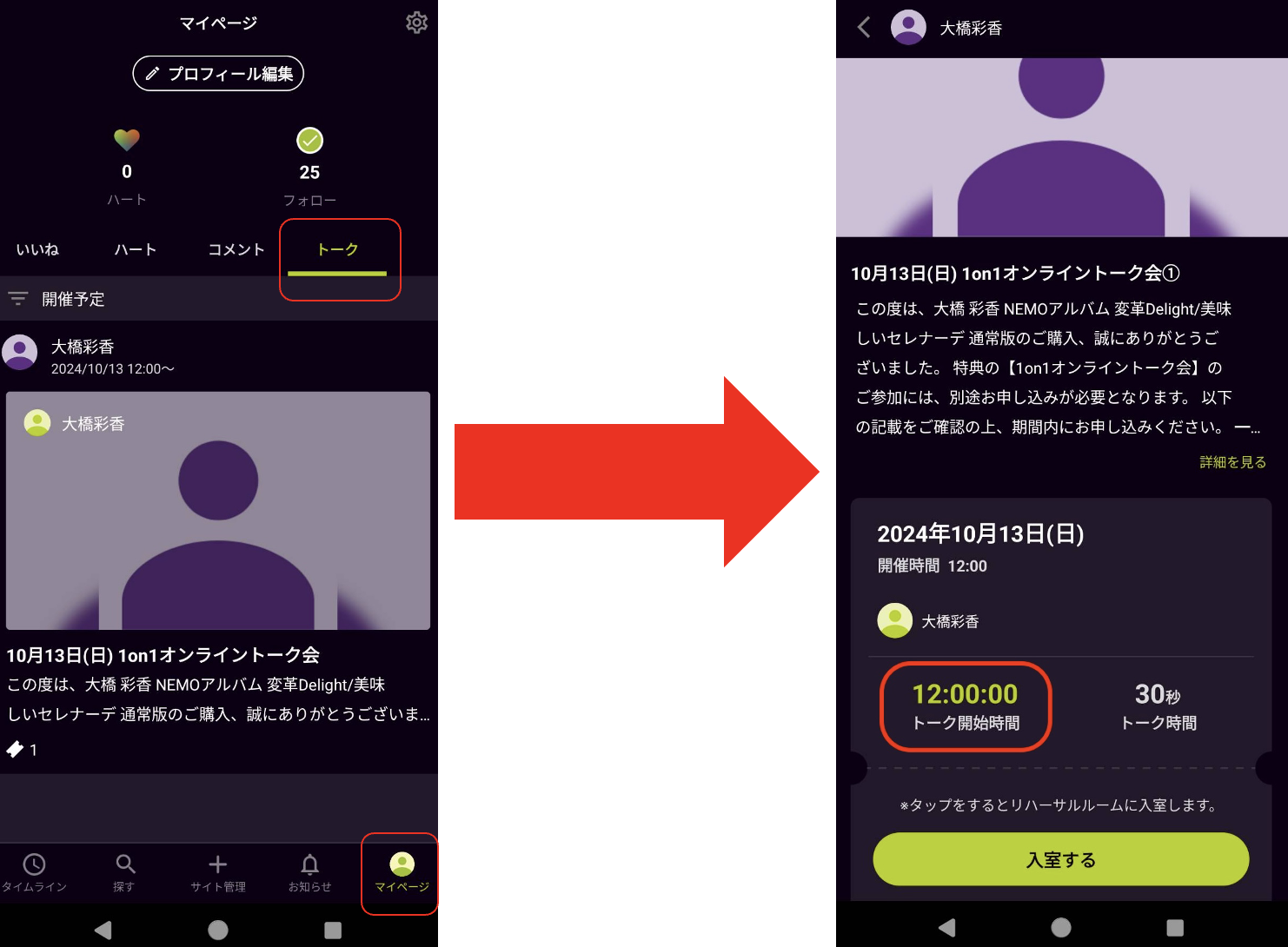 マイページ右側にある「トーク」のタブを開き、該当のビデオトークチケットをクリック、トーク開始時間の確認をお願いいたします。